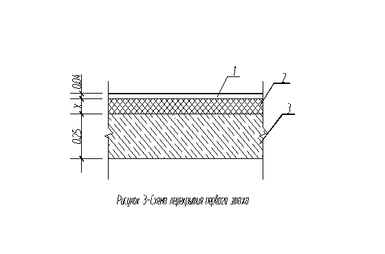 Для обеспечения требуемого по градусосуткам сопротивления теплопередаче R0тр = 3,25 м2×0С/Вт перекрытия по грунту, определяем его конструкцию и рассчитаем толщину утеплителя ( рис.3 ).