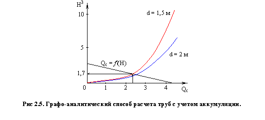 4. По данным гидравлических характеристик типовых труб (табл. IV [2] стр. 26) строят график пропускной способности Qтр = f∙(H) трубы данного отверстия и режима протекания и график Qс = f∙(H) по данным таблицы 2.1. Искомый расчетный сбросной расход с учетом аккумуляции Qс и величина подпора H соответствуют точке пересечения двух графиков Qс и Qтр.