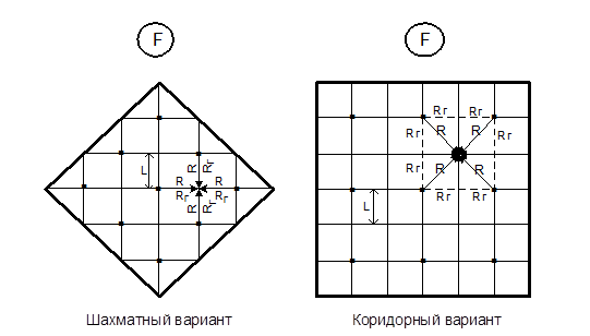 С увеличением радиуса действия ГРП (с уменьшением количества ГРП в жилом массиве) снижаются приведенные затраты по самим ГРП, а так же по распределительным сетям высокого давления. Вместе с тем возрастают затраты в распределительной сети низкого давления за счет увеличения их среднего диаметра. Под радиусом действия ГРП R подразумевают расстояние по прямой от ГРП до точки встречи потоков газа на границе между соседними ГРП. Выявим связь между радиусом действия ГРП R и радиусом действия газопровода Rr. Рассмотрим два варианта размещения ГРП на газоснабжаемой территории: шахматный и коридорный.