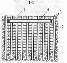 До начала земляных работ по всему периметру котлована устраивают шпунтовое ограждение (рис. 1). Цель шпунтового ограждения – воспрепятствовать сползанию и обрушению грунтовых массивов, находящихся за пределами строительной площадки. В качестве несущих элементов шпунтового ограждения используют металлические трубы или сортаментные прокатные балки – швеллеры или двутавры. Расчетом устанавливают расстояние металлическими элементами и их характеристики: для труб – это длина, диаметр, толщина стенки; для балок – длина и номер их сортамента.
