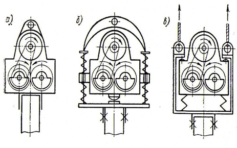 а – свободный беспружинный вибромолот; б – пружинный вибромолот с ударами, направленными вниз; в-то же, направленными вверх