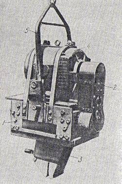 Наиболее выгодным, с точки зрения удовлетворения поставленным выше трем условиям, оказался клиновый наголовник, предложенный В.Н. Тупиковым и автором. К плите наголовника с помощью болтов, проходящих через нижнюю плиту вибратора, крепятся две массивные щеки 1, между которыми заводится погружаемый шпунт. Щеки наголовника и шпунт имеют отверстия, в которые заходит клин 2. Заводка последнего осуществляется винтом 3, вращающимся в массивной гайке 4, укрепленной к ребрам одной из щек наголовника.