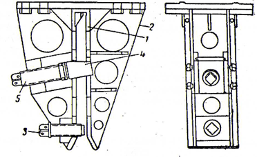 Наголовник вибратора ВПП-2 (рис. 16) принципиально не отличается от наголовника вибратора БТ-5. Он состоит из плиты и двух массивных щек 1, между которыми заводится шпунтина. Щеки усиливаются ребрами 2. Вверху между щеками имеется сменный вкладыш, размеры которого зависят от толщины шпунтины. Винт 3 (в нижней части) обеспечивает плотное прижатие стенки шпунта к одной из щек наголовника. Клин 4 и винт 5, с помощью которого клин заводится в отверстие, вырезанное в верхнем конце шпунтины, расположены под углом 80°. Это дает возможность крепить шпунтину и наголовник при ошибке в расстоянии от торца шпунтины до верхней кромки отверстия в 5 мм, а при неточной вырезке отверстия в шпунтине избежать прокладок или зачистки отверстия. Техническая характеристика вибратора ВПП-2 такова: