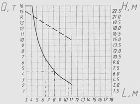 Технологические параметры крана при монтаже колонн определяем в табличной форме (табл. 8.). Вылет крюка в зависимости от грузоподъемности на крюке (LQ) и вылет крюка в зависимости от высоты подъема (LН) определяем по графику грузовых характеристик крана КС-4574(рис.1.)