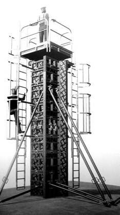 Для обеспечения пространственной жесткости опалубки колонны используют хомуты, располагаемые с шагом 0.4-0.6 м и имеющие быстро разъемные элементы. Устойчивость колонн достигается установкой растяжек. Применение домкратных устройств позволяет выполнить более точную регулировку и выверки опалубки перед установкой ее в проектное положение. Конструктивное решение таких устройств отличается возможностью быстрого демонтажа и переналадки, универсальностью и надежностью работы.
