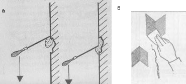 Частичная подмазка – осуществляется с целью ликвидации впадин и дыр образованных во время расшивки трещин, чтобы выровнять поверхность, (рис 5а). Осуществляется при помощи шпателя приёмом «ёлочка». Шпатлёвка наносится под углом 45градусов оси трещины с одной и другой стороны. Заполненная трещина приглаживается шпателем, (рис5б).