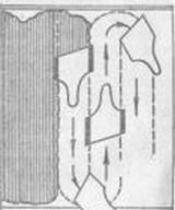 Первое сплошное шпатлевание поверхности – Вручную выполняется и разравнивается шпателем. Маляр набирает шпатлёвку на вспомогательный шпатель. Затем переносит её на основной и шпатель и наносит её на поверхность вертикальными движениями, при чём край каждого следующего слоя перекрывает предыдущий. (Рис 7).