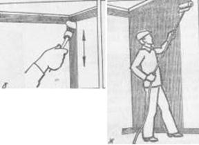 В некоторых случаях при выполнении высококачественной окраски применяют торцевание поверхности – что бы поверхность стала матовой. Лишённой блеска и шероховатой. Торцевание осуществляется щётками торцовками по свеженанесенному второму слою краски щётками торцовками в двух направлениях под углом 45 и 90 градусов. Держа торцовку перпендикулярно поверхности. Рис 9.