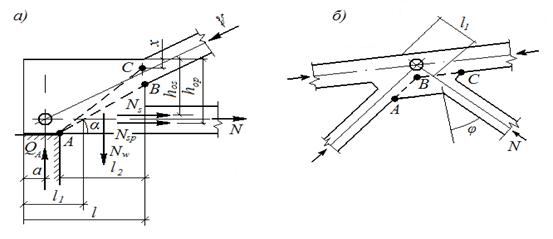 Рис. 6.1. К расчёту узлов фермы: а – опорного узла; б – промежуточного узла
