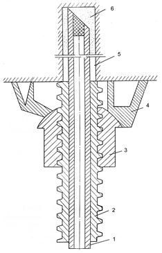 1 – композиционная трубка внутренним диаметром 10 мм, наружным – 19-20 мм; 2 – армополимерная муфта длиной 150 мм с наружной трапециидальной резьбой внешним диаметром 45 мм, внутренним – 32 мм, с шагом – 12 мм; 3 – армополимерная полусферическая гайка высотой 60 мм; 4 – полимерная опорная плитка высотой 45 мм, с диаметром основания 125 мм; 5 – скважина диаметром 28-32 мм; 6 – закрепляющая втулка (органическая композиция после полимеризации компонентов)