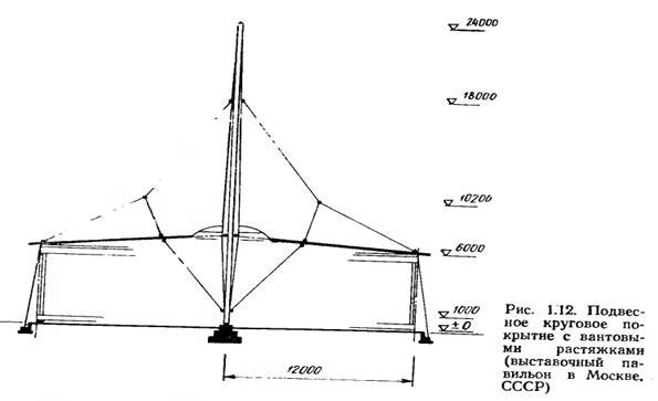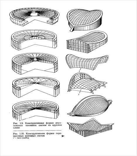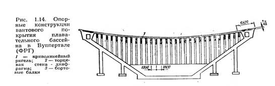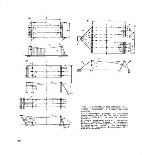 При устройстве предварительно-напряженных висячих покрытий одинарной кривизны ванты выполняют из круглой стали и размещают в ребрах, собираемых из отдельных железобетонных элементов; в этом случае плиты укладывают непосредственно по ребрам (рис. 20, в).