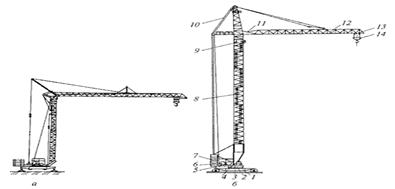 а – быстромонтируемый кран на винтовых опорах РБК-2-20; б – кран на рельсовом ходу КБ-504А: 1 - ходовая рама; 2 - опорно-поворотное устройство; 3 - поворотная платформа; 4 - механизм поворота; 5 - грузовая лебедка; 6 - стреловая лебедка; 7- противовес; 8 - башня; 9 - кабина; 10 - стреловой расчал; 11 - тележечная лебедка; 12 - стрела; 13 - грузовая тележка; 14 - крюковая подвеска.