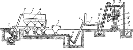 1 — дробилка для камня; 2 — элеватор, 3 — сортировка на фракции, 4 — бункера щебня; 5 — бункер песка; 6 — питатель; 7 — элеватор для холодной смеси; 8 — сушильный барабан, 9 — полка, 10 — подача нефти; 11 — элеватор для горячей смеси, 12 — бункера горячей смеси; 13 — элеватор для наполнителя, 14 — дозаторы, 15 — смеситель; 16 — самосвал, 17 — приемник для наполнителя.