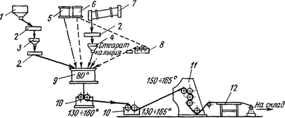Рис.4. Технологическая схема производства поливинилхлоридного линолеума вальцево-каландровым способом: