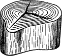 Отлупом называют внутреннюю трещину, идущую по годовому слою вдоль ствола (рис.5, е). Отлуп может быть дугообразный или кольцеобразный Морозобоиной называют наружную открытую продольную трещину, более широкую с внешней стороны ствола и сужающуюся к центру ствола. Трещины усушки встречаются очень часто в древесине почти всех пород (рис.7). Они образуются при высыхании древесины ниже точки насыщения волокон и распространяются от поверхности вглубь. Трещины снижают качество древесины, уменьшают количество полезной древесины и способствуют ее загниванию.
