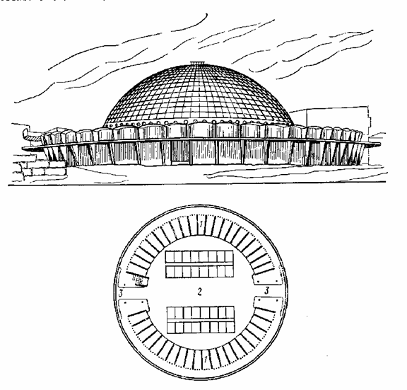 Проектирование залов пространственной безопорной структуры с крупнопролетными покрытиями повышает на 7—10% экономичное использование площадей.
