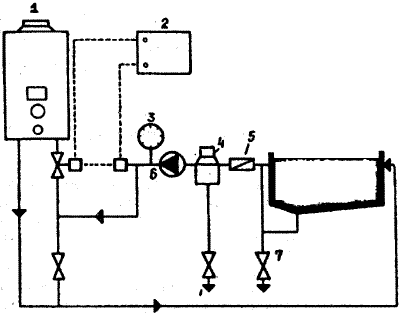 Рис. 11 - Прямоточный газовый нагреватель для обогрева: 1 - прямоточный газовый нагреватель; 2 - регулирующее устройство; 3 - термометр; 4 - фильтр; 5 - обратный клапан; 6 - насос; 7 - выпуск воды