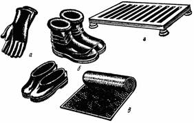 Рис. 4 - Защитные средства: а - диэлектрические перчатки; б - диэлектрические боты и галоши; в - диэлектрический резиновый коврик или дорожка; г - изолирующая подставка