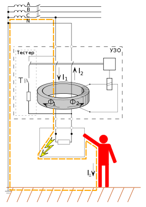 Любая утечка тока из защищаемой цепи на заземленные проводники (например, прикосновение человека, стоящего на мокром полу, к фазному проводнику) приводит к нарушению баланса в трансформаторе тока: через фазный проводник «втекает больше тока», чем возвращается по нулевому (часть тока утекает через тело человека, то есть помимо трансформатора). Несбалансированный ток в первичной обмотке трансформатора тока приводит к появлению ЭДС во вторичной обмотке. Эта ЭДС сразу же регистрируется следящим устройством (7), которое отключает питание соленоида (5). Отключенный соленоид больше не удерживает контакты (4) в замкнутом состоянии, и они размыкаются под действием силы пружины, обесточивая неисправную нагрузку.