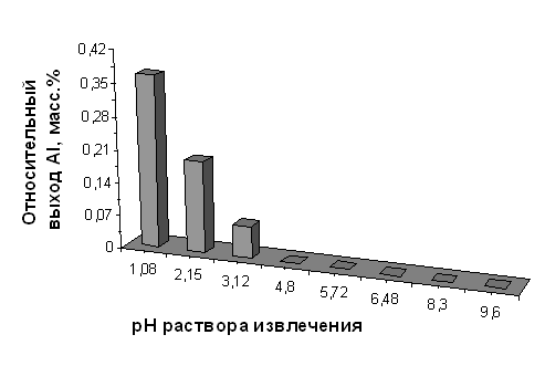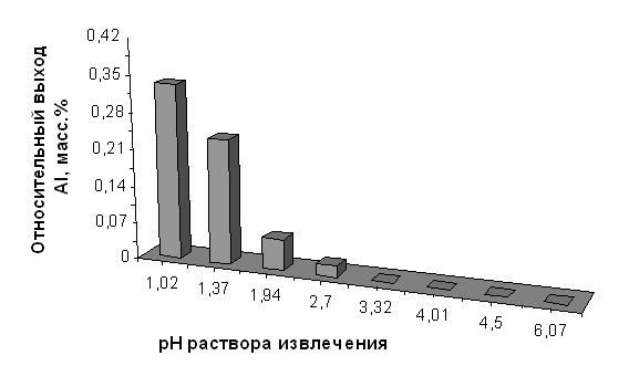 Относительный выход алюминия из диатомита, прокалённого при 850°С, в зависимости от значения рН раствора извлечения