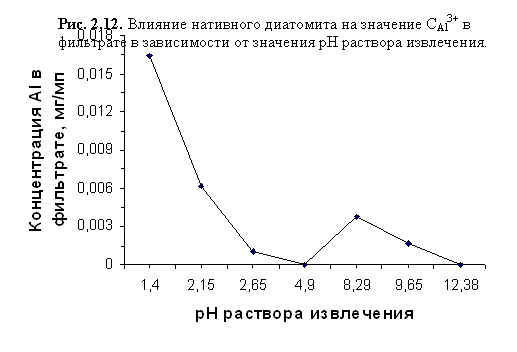 Резкое уменьшение концентрации исследуемого иона в фильтратах при рНисх<4,9 связано с тем, что его адсорбция на обменных позициях глинистых минералов и поверхности аморфного кремнезёма происходит быстрее, чем трансформация поверхностных слоёв кристаллической решётки алюмосиликатов, так как требует меньших затрат энергии. Адсорбировавшись на поверхности кристаллитов, ионы Al3+ затрудняют проникновение протонов внутрь, защищая решётку от разрушения. В кислой среде происходит наложение процессов поглощения Al3+ диатомитом и выщелачивания алюминия из его глинистой составляющей.