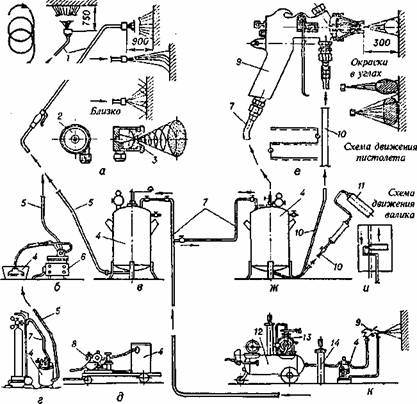 а — работа универсальной удочки; б — подача состава к удочке электрокраскопультом; в — то же, от красконагнетательного бачка; г — то же, с использованием баллона со сжатым воздухом; д — агрегат для окраски потолков; е — работа пистолетом-распылителем; ж — подача состава к пистолету и валику от красконагнетательного бачка; и — работа пневматическим валиком; к — агрегат для масляной окраски; 1 — универсальная удочка с форсункой; 2 — крышка форсунки распылителя; 3 — корпус распылителя; 4 — бачки с малярным составом; 5 — шланги для подачи водно-клеевых малярных составов; 6 — электрокраскопульт; 7 — шланги (трубы) для подачи сжатого воздуха; 8 — растворонасос для подачи известковых составов; 9 — пистолеты-распылители; 10 — шланги для подачи масляных составов; 11 — поролоновый валик; 12 — воздухосборник; 13 — компрессор; 14 — масловодоочиститель.