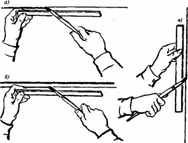 При вытягивании филенок филенчатой кистью по деревянной линейке один конец линейки прикладывают к стене, а другой держат левой рукой (рис. 2 а).