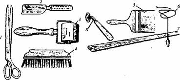 Проклейка поверхностей. Клеевой раствор наносят на поверхности маховой кистью после прочистки стен лещадью. Проклеивать нужно не все поверхности сразу, а лишь их часть, чтобы до оклейки макулатурой они высохли не полностью, а лишь успели слегка провянуть. Для оклейки поверхностей под обои чаще всего используют газеты, которые укладывают на полу стопкой и намазывают клейстером. Эту работу выполняют два маляра. Один намазывает листы макулатуры маховой кистью и подает их, а второй прикладывает намазанные листы к поверхности стены и разглаживает ветошью или волосяной щеткой так, чтобы на бумаге не оставалось морщин и пузырей. Инструменты для обойных работ показаны на рис. 11.6.