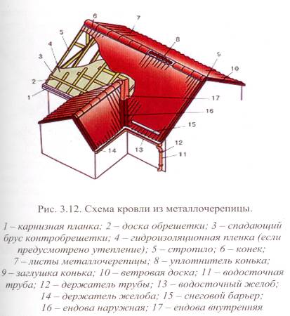 Среди кровельных материалов, получивших широкое распространение в последнее время, одно из первых мест по популярности занимает цельнолистовая металлочерепица. Она является разновидностью профилированного стального оцинкованного листа с полимерным покрытием, который подвергается поперечному штампованию, для получения рисунка, имитирующего натуральную черепицу. Схема кровли из металлочерепицы представлена на рис. 3.12.