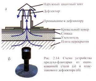 При производстве кровельных работ методом инфракрасного излучения ИК облучения с восстановлением (регенерацией) старого кровельного ковра и укладкой слоя нового бронированного материала создается монолитное покрытие крыши. При этом влага, оставшаяся в утеплителе и перекрытии, при нагревании (в летний период) начинает давить на вновь созданный ковер, в результате чего образуются вздутия (воздушные пузыри). Для устранения этих явлений, а также для просушки утеплителя рекомендуется установка продухов флюгарок из оцинкованной стали или пластиковых дефлекторов (рис. 2.14) из расчета 1 шт на 50 м2.