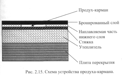 Устройство кровельных машин позволяет создать продух-карман в нижнем слое наплавляемого рулонного материала, с качественной приклейкой боковых поверхностей рулонного полотна (рис. 2.15). Продухи-карманы проходят 1 по всей поверхности крыши и соединены между собой проходами. Для лучшей вентиляции кровли устанавливаются продухи-флюгарки из оцинкованной стали или пластиковые дефлекторы из расчета 1 шт. на 70-100 м². Верхний бронированный слой наплавляется по всей поверхности полотна.