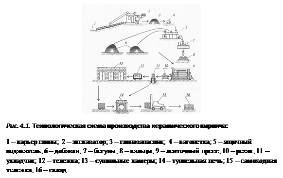 Производство кирпича методом пластического формования ведется на хорошо обработанной пластичной массе с влажностью 15…25% из легкоплавких глин средней пластичности (рис.4.1).