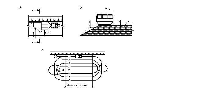 Рис.9. Схема уплотнения насыпи катком: а - план; б - разрез; в - траектория движения катка; 1 - перекрытие полос; 2 - направление укатки; 3 - рыхлый слой грунта