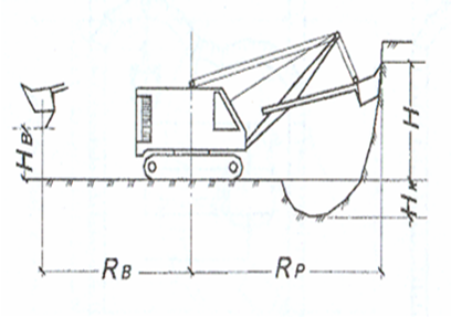 Рис.11. – Рабочие параметры и профили забоя экскаваторов с прямой лопатой и канатным управлением: Rp = 6,8м - радиус резания; Rв =5,4м - радиус выгрузки; Н=7,66м – высота резания; Нк - глубина резания; Нв =4,2м - высота выгрузки