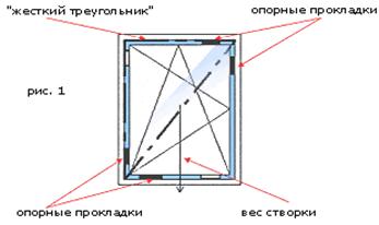 А) Прокладки под стеклопакет на несущие фальцевые вкладыши установить плотно, в натяг, чтобы створка со стеклопакетом образовывала жесткий треугольник (рис.1). Для этой цели используют специальную пластмассовую лопаточку. Если этого не выполнить, створка провиснет в первые же дни.