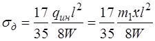 Если вибрирует балка на двух шарнирных опорах под действием собственного веса и равномерно распределенной нагрузки, то динамическое напряжение можно вычислить по формуле:
