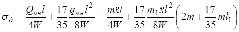 При вибрации балки, несущей равномерно распределенную нагрузку и сосредоточенный груз посередине пролета, динамическое напряжение найдется по формуле