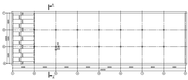 Административно - бытовое здание в г. Киров имеет размеры в осях: длина 64 м., ширина 18 м. Размеры конструктивной ячейки: 8 х 6,2 м.