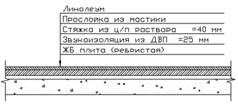 Постоянная Линолеум на мастике Стяжка из цементно - песчаного раствора δ=40 мм. Звукоизоляционный слой из ДВП δ=25 мм Сборная ж/б ребристая плита с заполнением швов раствором Перегородки |