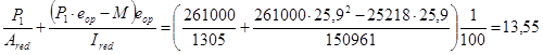 Вычисляем сжимающее напряжение в бетоне на уровне центра тяжести напрягаемой арматуры от усилия обжатия Р1 и с учётом изгибающего момента от веса плиты