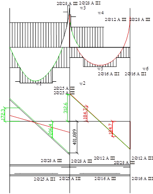Арматура 2 Ø28 доводим до опор и 2Ø12 обрывается