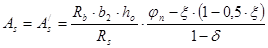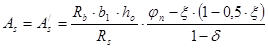 Если условие (56) не выполняется, площадь арматуры определяют с учётом формул (58)-(62), последовательно вычисляя φs, α и ξ; в итоге площадь арматуры Аs и А/s находят по формуле (72). При этом