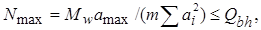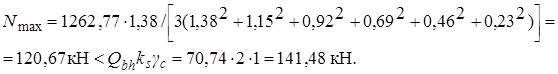 Расчет стыка стенки. Расчетный момент, приходящийся на стенку, уравновешивается суммой внутренних пар усилий, действующих на болты. Максимальное горизонтальное усилие Nmax от изгибающего момента, действующее на каждый крайний наиболее напряженный болт, не должно быть больше несущей способности Qbh.