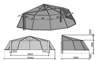 Витраж выполняет функции покрытия и светового фонаря. Каркас витража выполняется из системы металлических балок, опёртых на металлическую раму, которая в свою очередь опирается на две колонны. Металлические конструкции скрепляются сварными соединениями. Основная рама крепится к колоннам путём сварки с закладными деталями колонн. Светопрозрачный материал витража – зеркальное стекло с 95% светопроницаемостью. Металлические балки в сечении состоят из двух уголков, на полки которых укладывается остекление.