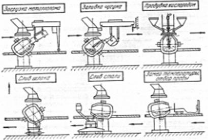 Ход процесса. Процесс производства стали в кислородном конвертере состоит из следующих основных периодов (рис 3); загрузки металлолома, заливки чугуна, продувки кислородом, загрузки шлакообразующих, слива стали и шлака.