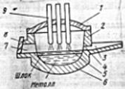 4 – сталевыпускное отверстие; 5 – электрическая дуга; 6 – сферический под; 7 – рабочее окно; 8 – заслонка; 9 – электроды