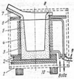 1 – каркас; 2 – подовая плита; 3 – водоохлаждаемый индуктор; 4 – изоляционный слой; 5 – тигель; 6 – абсоцементная плита; 7 – сливной носок; 8 – воротник; 9 – гибкий токоподвод; 10 – опорные брусья
