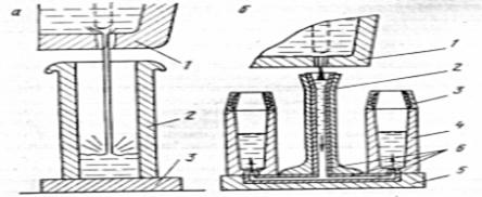 Б – разливка сифоном: 1 – сталеразливочный ковш; 2 – центровая трубка; 3 – прибыльная надставка; 4 – изложница; 5 – поддон; 6 – сифонные трубки