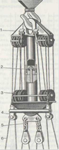 УНІВЕРСАЛЬНИЙ ВАНТАЖОЗАХВАТНИЙ ПРИСТРІЙ З ГІДРОКАНТОВАЧЕМ: 1 - верхня обойма поліспас, 2 - гідротормоз, 3 - нижня обойма поліспасту, 4 - розчалка, 5 - блочна підвіска, 6 - стропи кріплення панелі на панелі-возі, прибирає столик-стремянку і дає машиністу крана команду натягнути гілки.