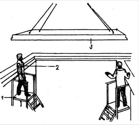 Монтажники кельмами розстиляють опорну поверхню стін і перегородок, працюючи з перекриття і з драбини, встановленої на нижчележачому перекритті. Потім укладають розчин по всьому контуру торцевих (опорних) поверхонь панелей стін і кельмою розстилають його рівним шаром. По закінченні цієї роботи, монтажники піднімаються на вже покладену панель монтуємого перекриття і приймають що подається краном панель, орієнтуючи її над місцем укладки. Машиніст крана плавно опускає панель на розчин, а монтажники направляють її руками. Крайні панелі перекриття укладають з драбин.